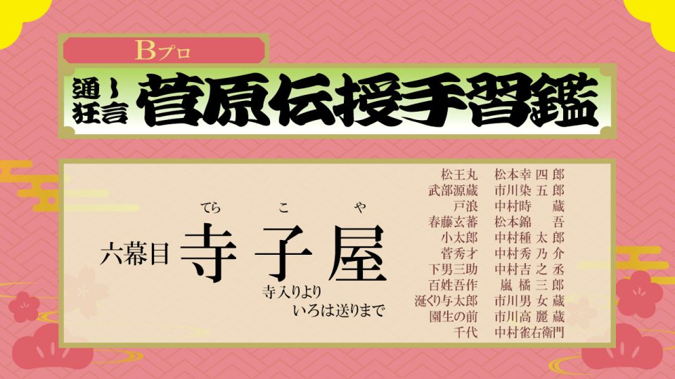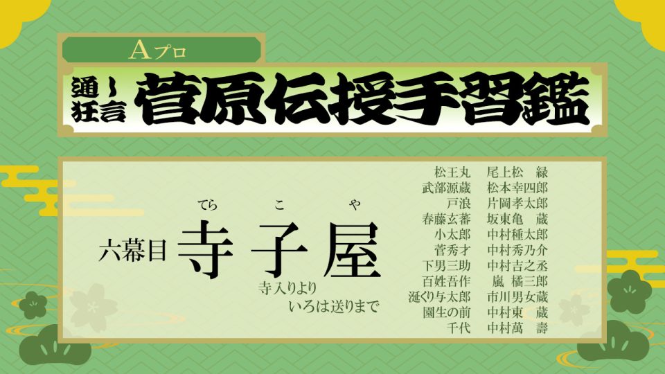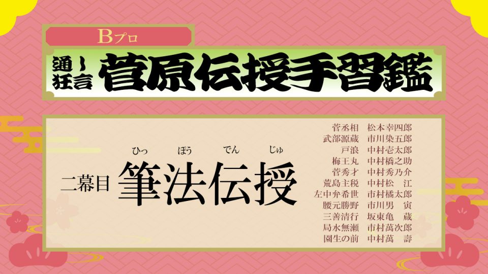 【配役】 菅丞相 = 松本幸四郎 武部源蔵 = 市川染五郎 戸浪 = 中村壱太郎 梅王丸 = 中村橋之助 菅秀才 = 中村秀乃介 荒島主税 = 中村松江 左中弁希世 = 市村橘太郎 腰