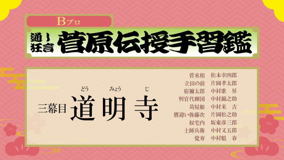 【配役】 菅丞相 = 松本幸四郎 立田の前 = 片岡孝太郎 宿禰太郎 = 中村歌昇 判官代輝国 = 中村錦之助 苅屋姫 = 中村米吉 贋迎い弥藤次 = 片岡松之助 奴宅内 = 坂東彦三郎