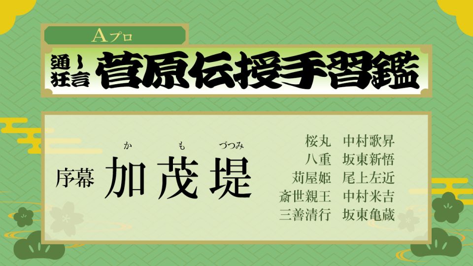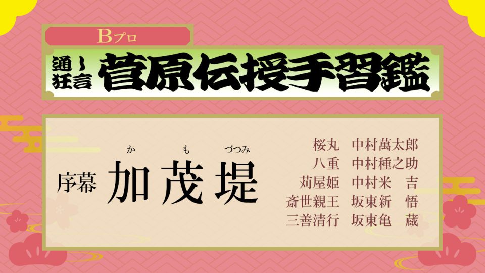 【配役】 桜丸 = 中村歌昇 八重 = 坂東新悟 苅屋姫 = 尾上左近 斎世親王 = 中村米吉 三善清行 = 坂東亀蔵
