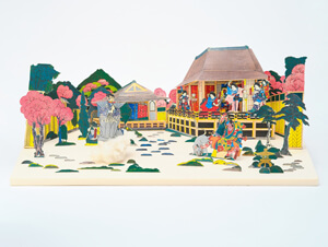 このたび、歌舞伎座「四月大歌舞伎」昼の部『裏表先代萩』にちなみ、公演期間中、松竹大谷図書館所蔵の組上燈籠絵(くみあげどうろうえ)『先代萩 御殿・床下』組上完成形(復刻版)を場内で展示します。『伽羅先代萩』の「御殿」の場と、続く「床下」の場を一つの構図に盛り込んだ組上燈籠絵です。「御殿」では鶴千代の乳人政岡と八汐が対決し、「床下」では、仁木の妖術で消えていく煙を模した真綿で表現しています。