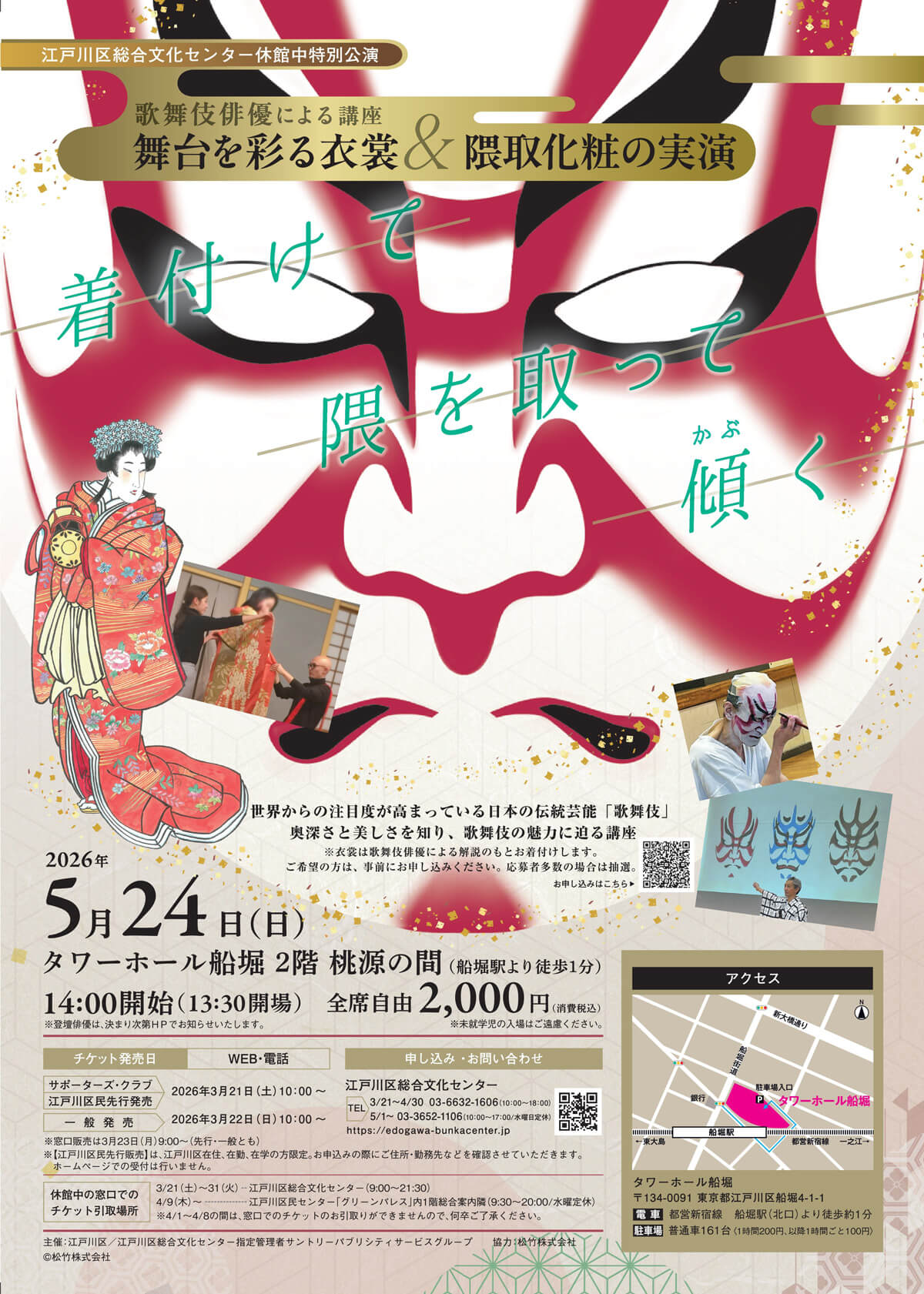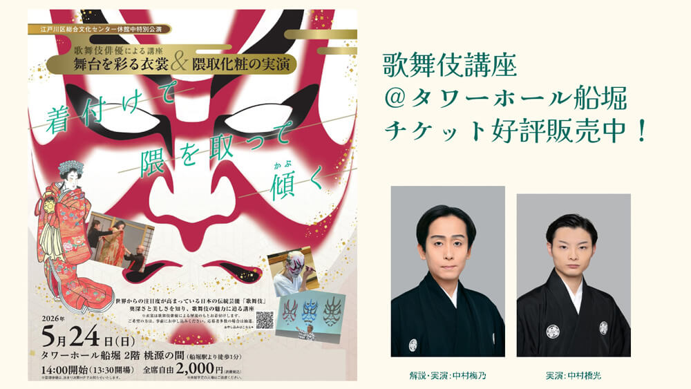 2026年5月24日(日)、江戸川区のタワーホール船堀で、歌舞伎のワークショップ『歌舞伎俳優による講座~舞台を彩る衣裳&隈取化粧の実演~』が開催されます。