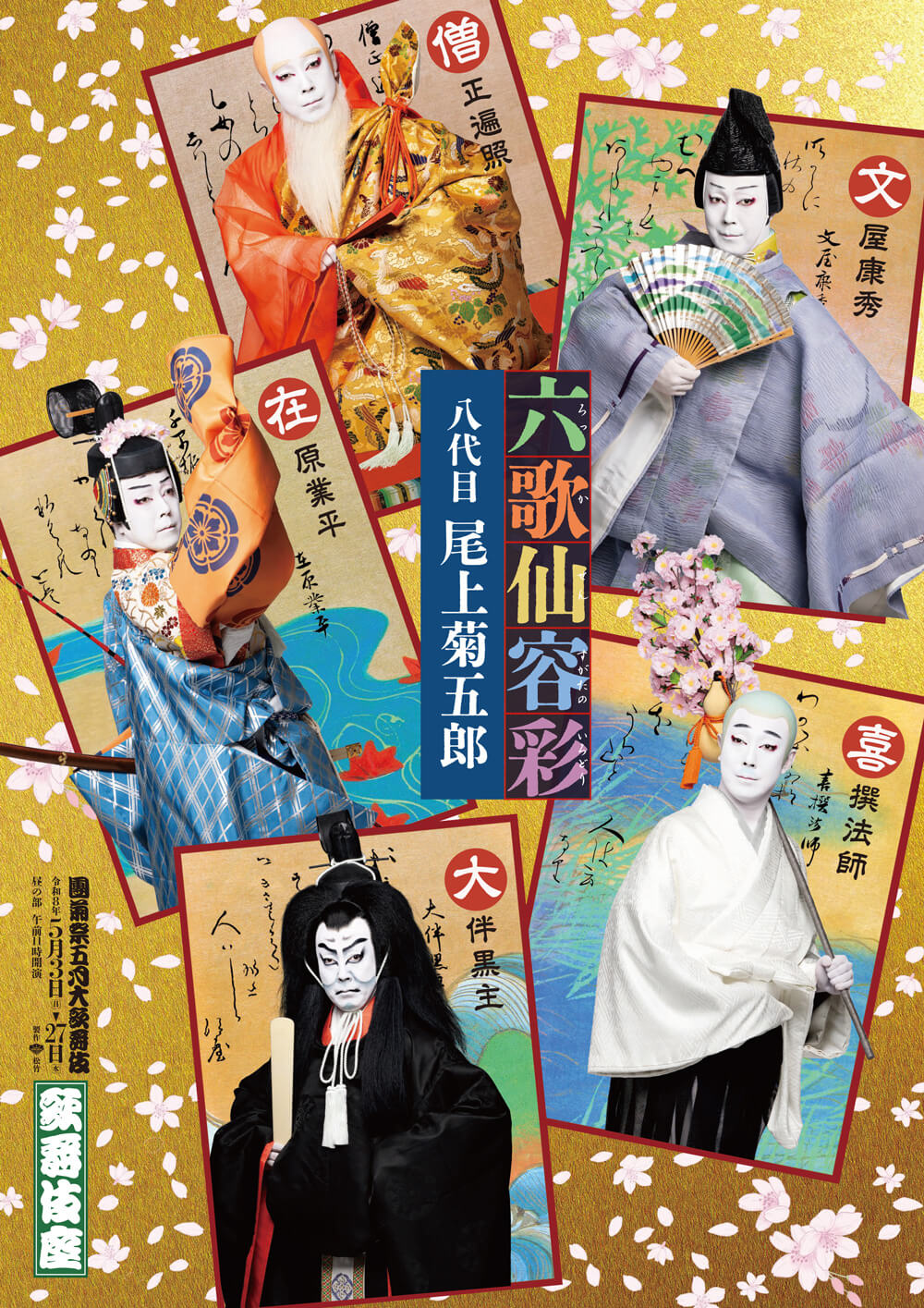 このたび、公演に先立ち、特別ビジュアルが公開されました。歌の名人として名高い六歌仙の内、八代目菊五郎が勤める5人の歌のかるたが散りばめられ、それぞれの札にあるその姿は今にも飛び出しそうで、本作らしい華やかさ、賑やかさがあふれ出る1枚です。八代目菊五郎が、一人5役を勤める洒落っ気あふれる変化舞踊『六歌仙容彩』にご期待ください。