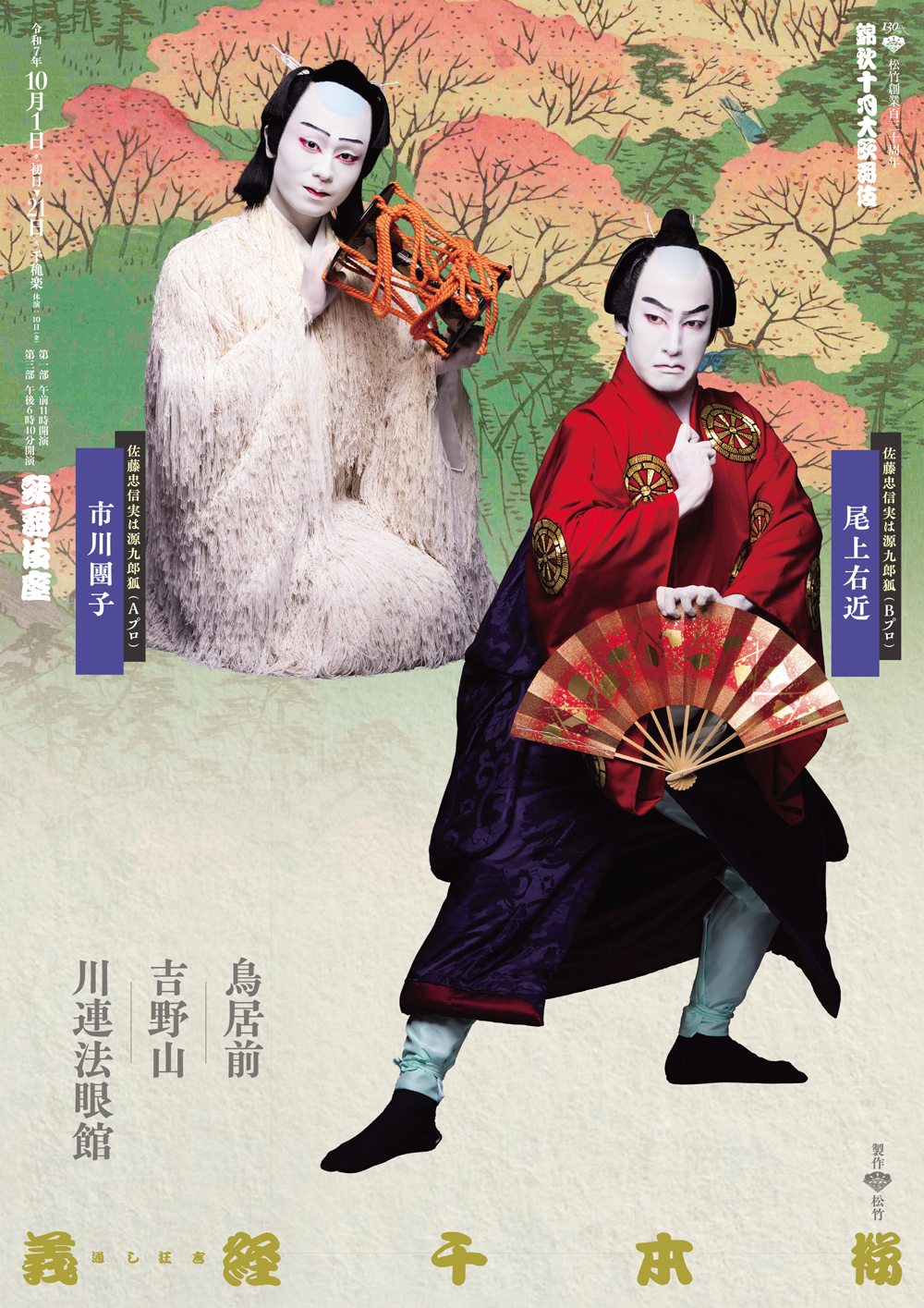 第三部では、第一部の「鳥居前」に続き、Aプロで市川團子、Bプロで尾上右近が佐藤忠信実は源九郎狐を勤めます。特別ビジュアルには、桜咲き誇る吉野山の錦絵を背景に、「吉野山」の右近、「川連法眼館」通称“四の切”の團子による忠信実は源九郎狐の姿があしらわれます。華やかな舞踊劇「吉野山」から、義経の温情が絡み親子の情愛に心温まる「川連法眼館」をお楽しみいただきます。