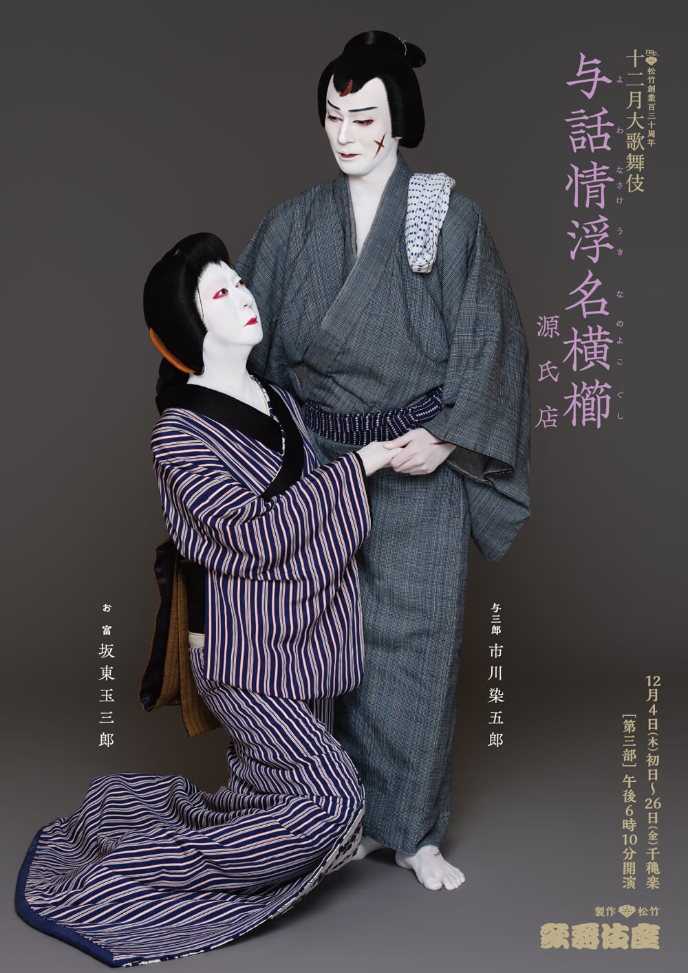 松竹創業130周年の掉尾を飾る、歌舞伎座「十二月大歌舞伎」。第三部では、『与話情浮名横櫛』より「源氏店」を上演します。「切られ与三」の通称で知られる本作は、男女の数奇な巡り合わせを描いた世話物の人気作です。艶やかに色気を漂わせるお富を坂東玉三郎、退廃的な美しさを纏う与三郎を初役の市川染五郎が勤めます。