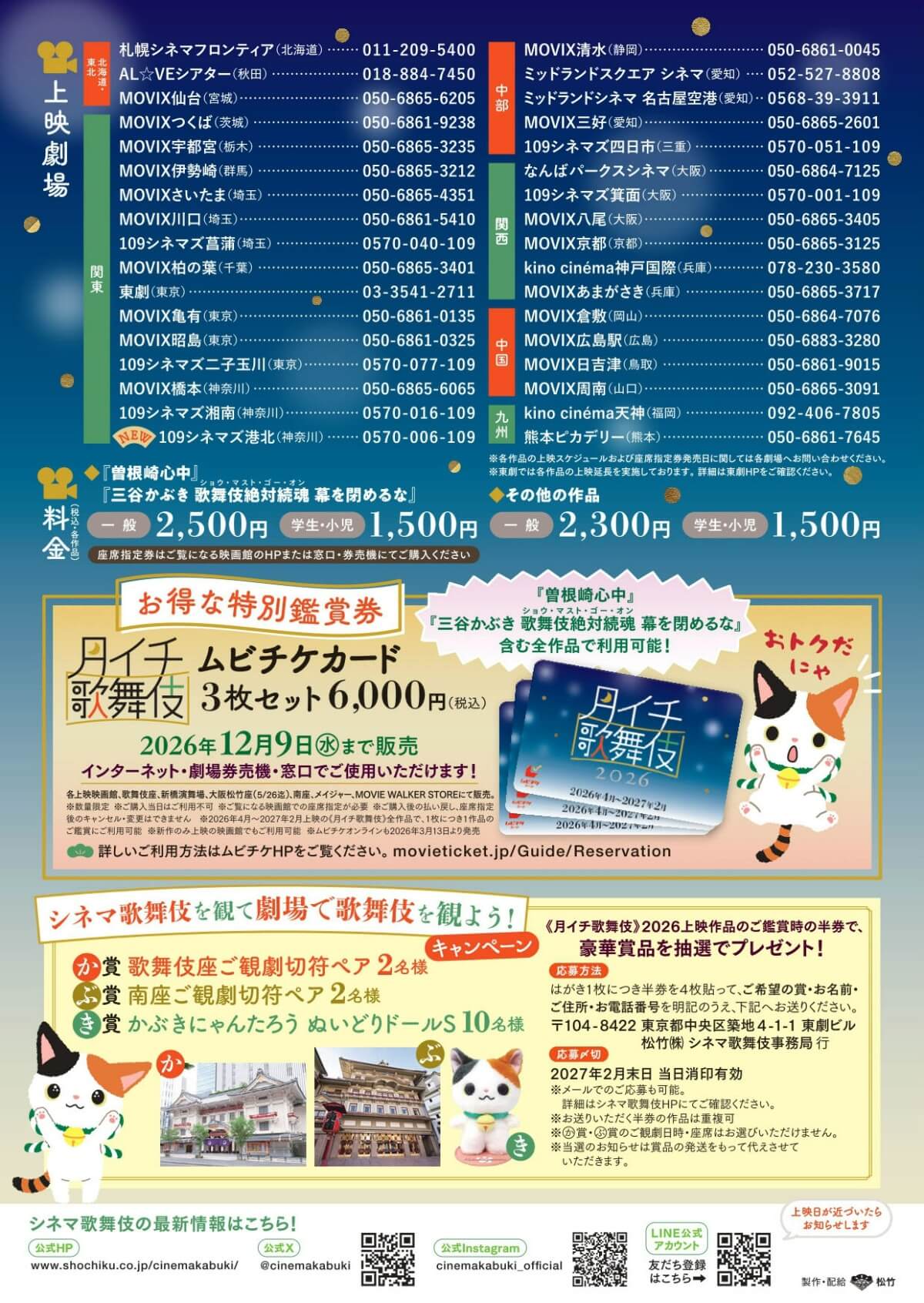 歌舞伎座、新橋演舞場、大阪松竹座(5月26日[火]まで)、南座、各上映画館