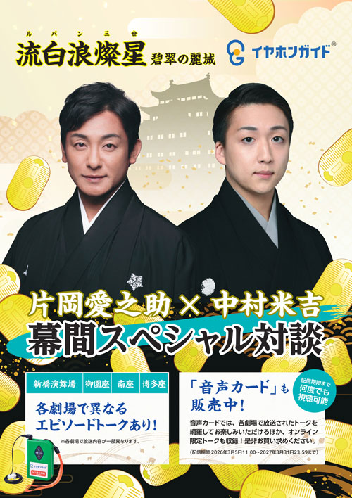 2026年3月5日(木)より新橋演舞場で上演される『流白浪燦星』「碧翠の麗城」のイヤホンガイドで、幕間休憩中に片岡愛之助と中村米吉のスペシャル対談の放送が決定。「イヤホンガイド満喫セット」が販売されます。