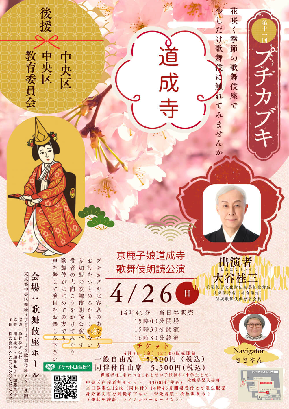 2026年4月26日(日)、歌舞伎座タワー5階の歌舞伎座ホール(旧木挽町ホール)で、「第十一回プチカブキ『道成寺(京鹿子娘道成寺 歌舞伎朗読公演)』」が行われます。