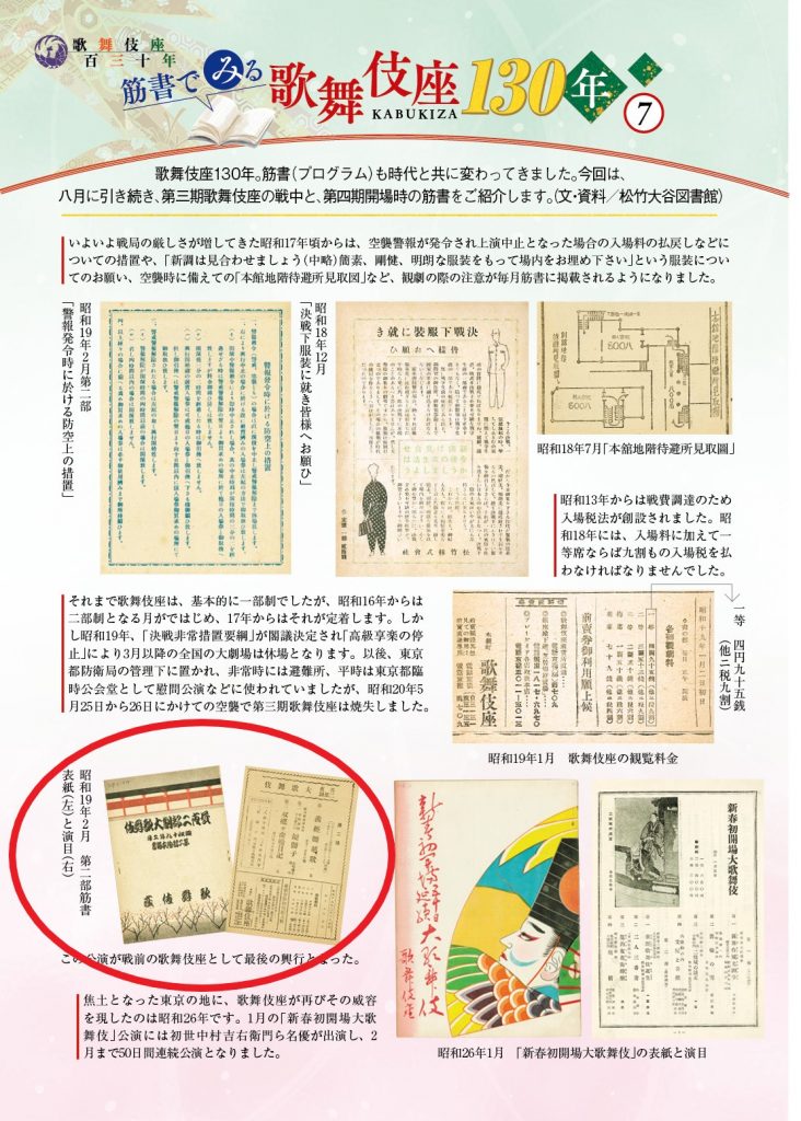 記事左下(丸印)には、戦中最後の筋書となった昭和19(1944)年2月「昼夜二部制大歌舞伎」の筋書を掲載しています。この興行の千穐楽目前の2月25日に「決戦非常措置要綱」が閣議決定され、その第七項「高級享楽の停止」に基づき、歌舞伎座をはじめ全国の大劇場は3月より一斉休場することとなりました。その後、歌舞伎座は官公署などに賃貸される東京都の臨時公会堂に指定され、8月以降は慰安公演などの短期の公演が行われました。そのため、歌舞伎座における本興行はこの2月をもって中断することとなったのです。