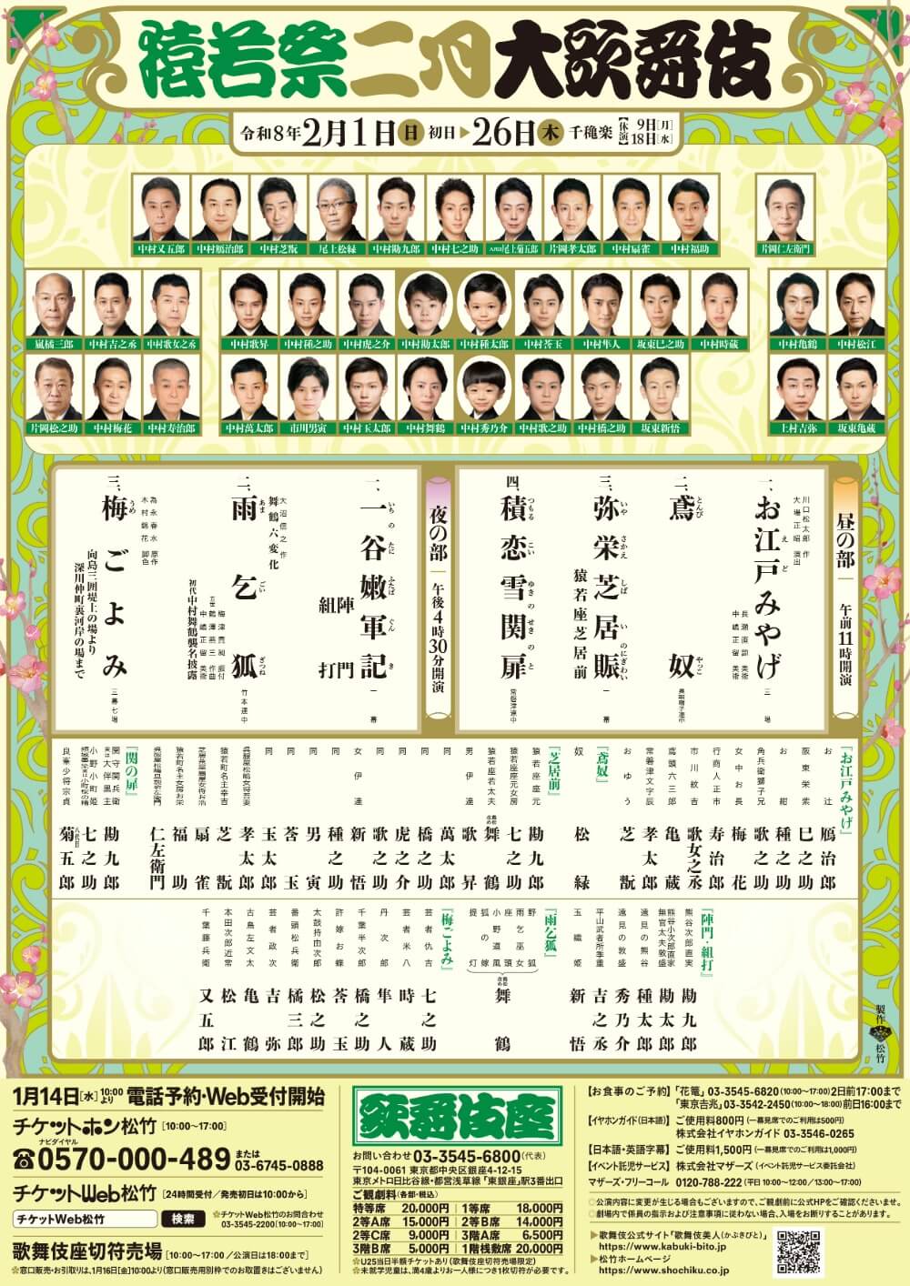 歌舞伎座 販売営業課 03-3545-6855(10:00~18:00/休演日・休館日10:00~17:00)