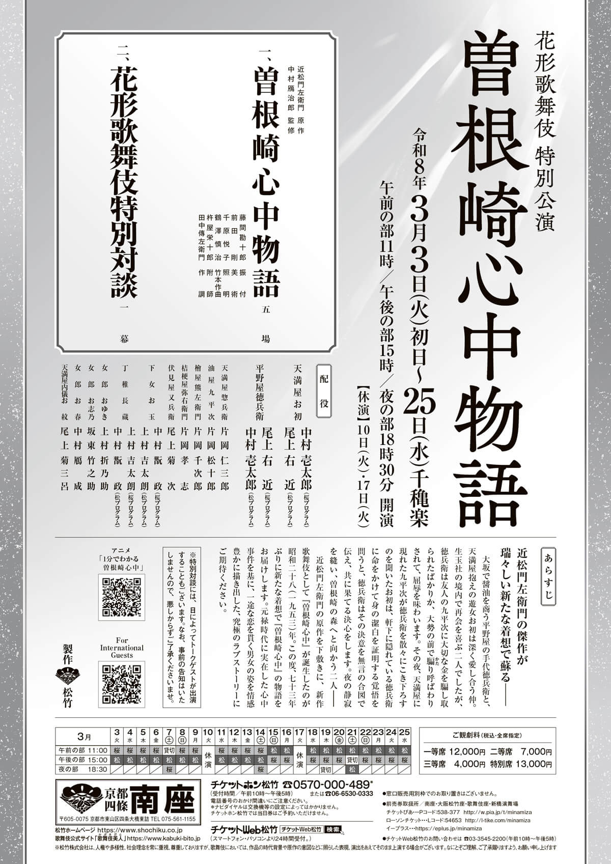 近松門左衛門の原作を下敷きに、新作歌舞伎として『曽根崎心中』が誕生したのが昭和28(1953)年。このたび、73年ぶりに新たな着想で『曽根崎心中』の物語をお届けします。元禄時代に実在した心中事件を基に、一途な恋を貫く男女の姿を情感豊かに描き出した、究極のラブストーリーにご期待ください。