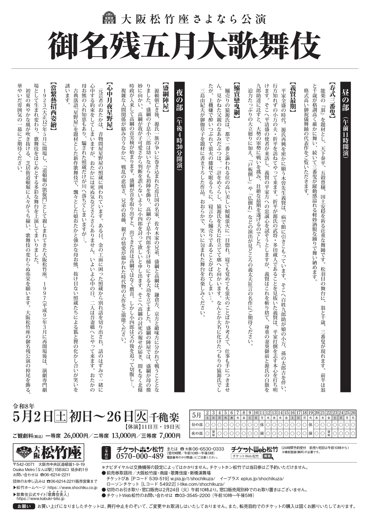 公演日、上演時間、出演者、演目などが急遽予定変更となる場合がございます。あらかじめご了承ください